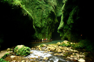 通灵大峡谷位于靖西县城东南部32公里的湖润镇新灵村,古龙山水源林自然保护区的南端,由念八峡、铜灵霞、古劳峡、新灵峡、新桥峡组成,总长10多公里。念八河从古龙山脉缓蜒而下,依次穿越五个峡谷,流入湖润台地。每个峡谷内荟萃了罕见的特高瀑布群、洞中瀑布、地下暗河、峡谷溪流、洞穴奇观、古石垒、古悬葬、原始植被等自然景观与人文景观。
